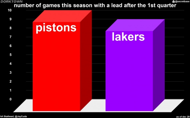 这就很难评!本赛季至今活塞首节领先场次10场 湖人9场