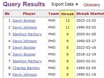 至此,布克已连续12场比赛至少得到20分5助攻,这个数据排名队史第一。榜单详情如下: