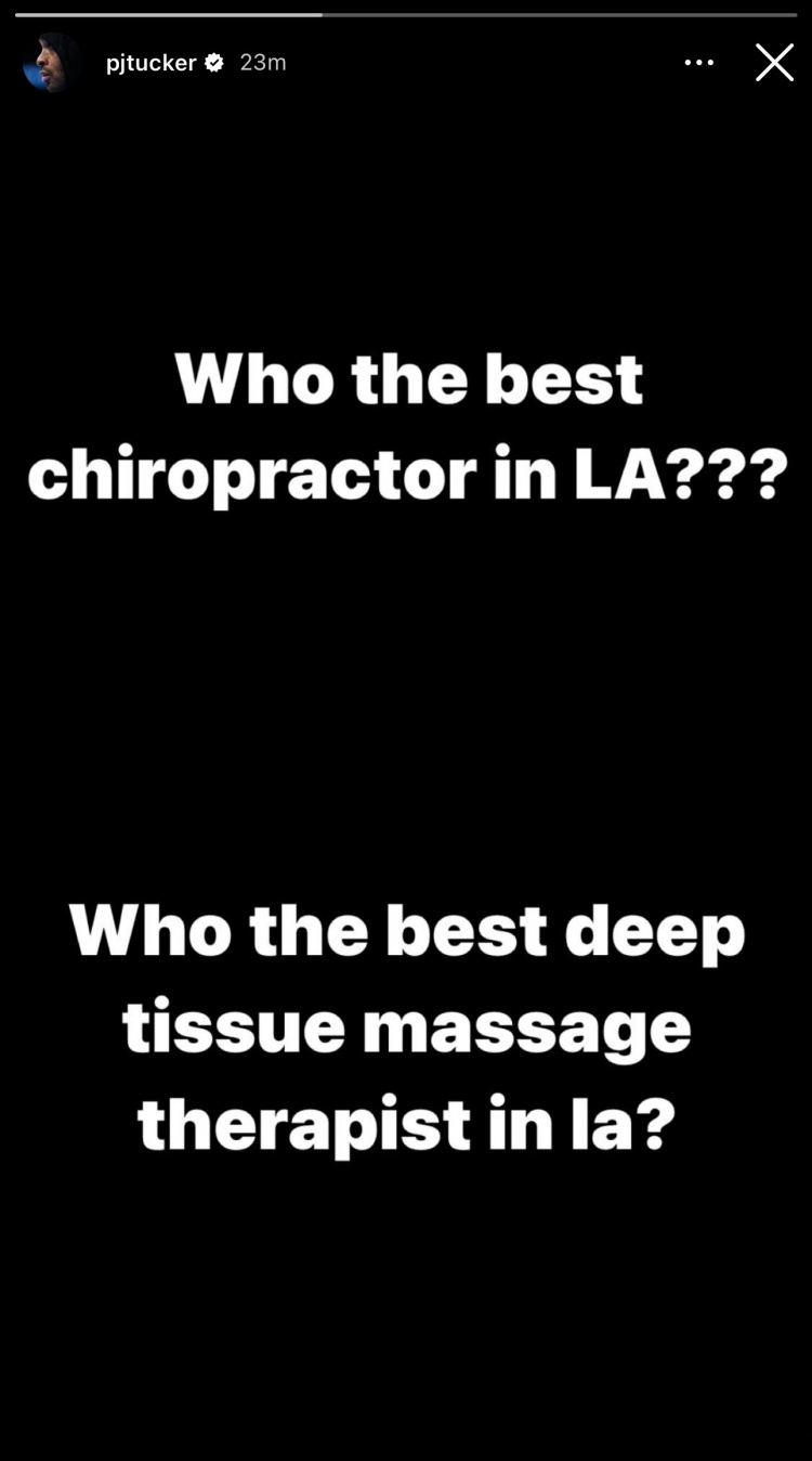 中场休息时,快船59-54领先5分。快船前锋PJ-塔克更新INS写道:“谁是洛杉矶最好的脊椎按摩治疗师,谁是洛杉矶最好的深层组织按摩师?”