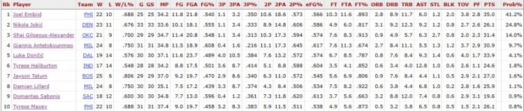 1月1日讯 海外知名数据媒体Basketball Reference今日更新了本赛季MVP获奖者概率,详情如下: