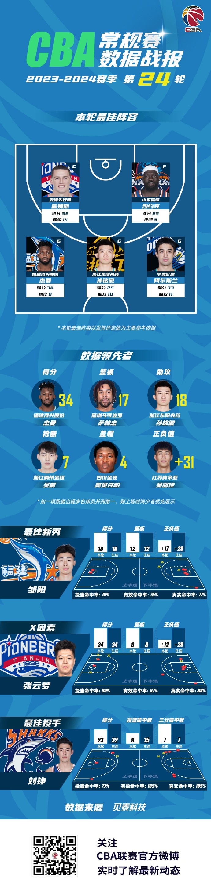 常规赛第24轮最佳阵容:孙铭徽&阿尔斯兰&詹姆斯&沙约克&杰曼