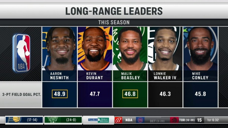 本赛季三分命中率Top5:杜兰特47.7%距次席 比斯利&朗尼-沃克上榜