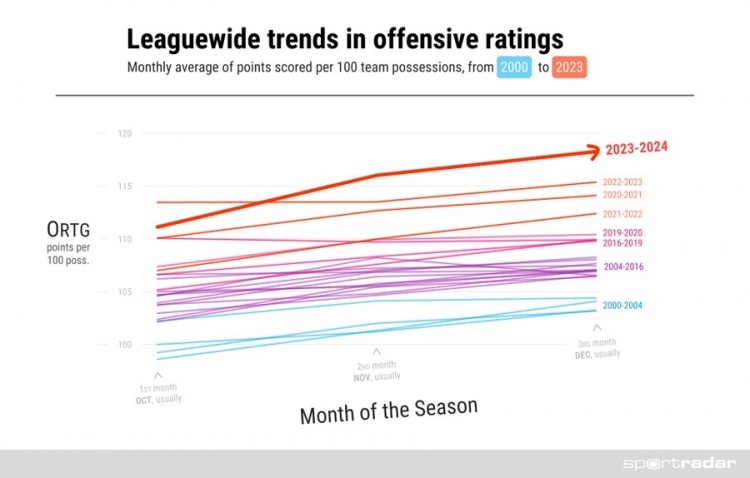 进攻狂潮!联盟球队上月百回合得分达到118分 2000年以来最高!