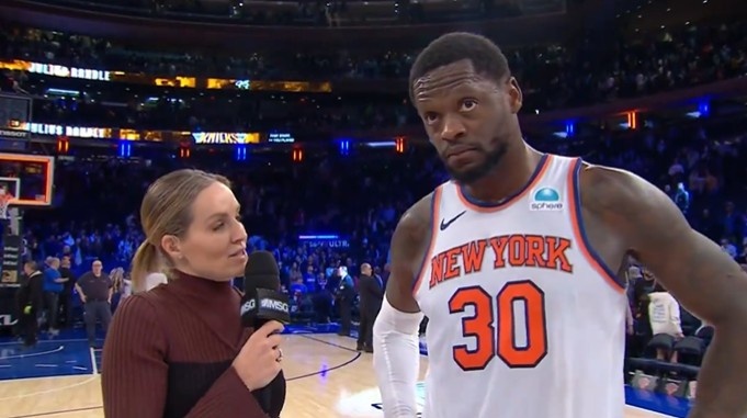 1月2日讯 NBA常规赛,尼克斯112-106力克森林狼,兰德尔在场边接受了媒体采访。
