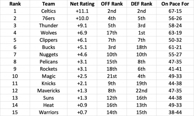 1月2日讯 美记Shane Young今日列出了截止至今净胜分前15的球队,并根据数据模型预测出了他们的最终战绩。目前凯尔特人、76人、雷霆净胜分排名前三。凯尔特