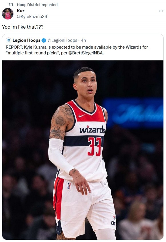 1月3日讯 据美媒ClutchPoints记者Brett Siegel报道,消息人士称,如有下家付出多个首轮签,奇才可能会交易库兹马。库兹马本人转发了这则消息,并发问:“我就值这