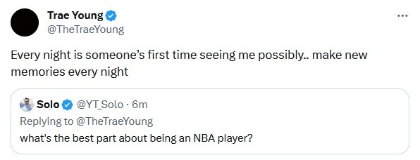 特雷-杨回答:“每场比赛都有可能是某人第一次见到我,所以我每次都在创造新的记忆。”