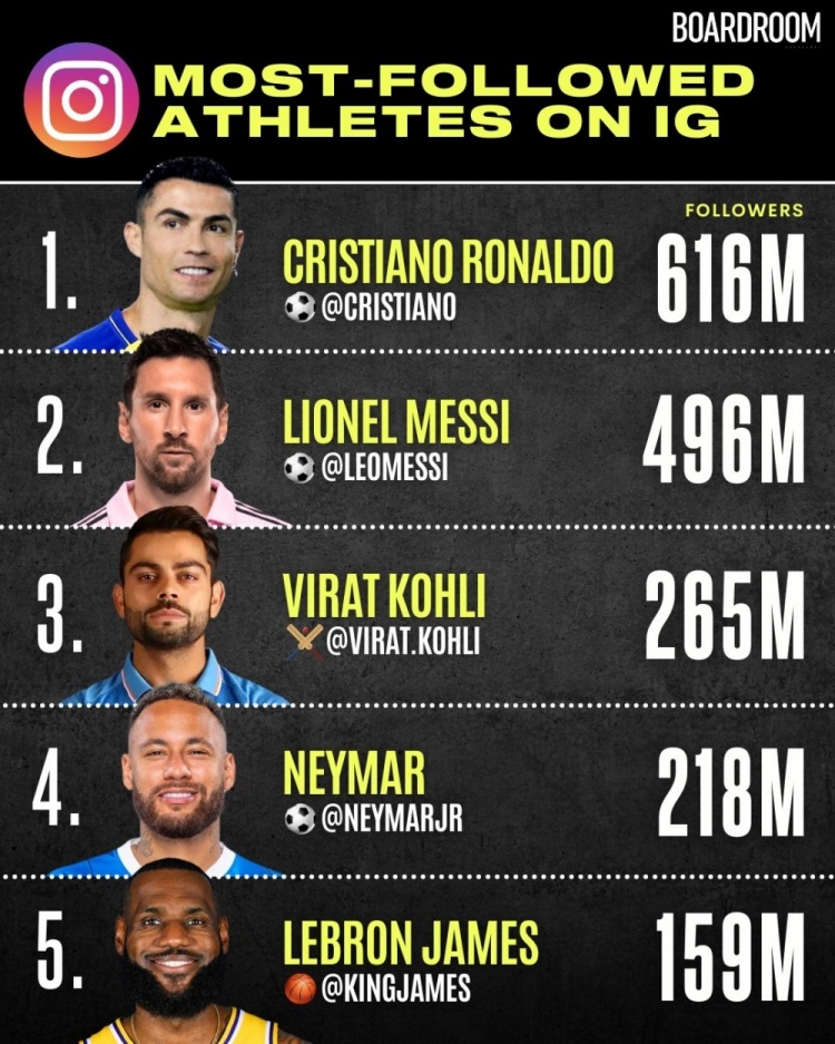 运动员INS粉丝总数:C罗6.16亿居首梅西次席 詹姆斯第五