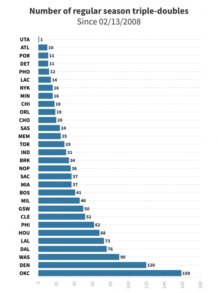 美记Adam Aaronson统计了爵士三双荒期间,联盟其他各队的三双数,详情如下: