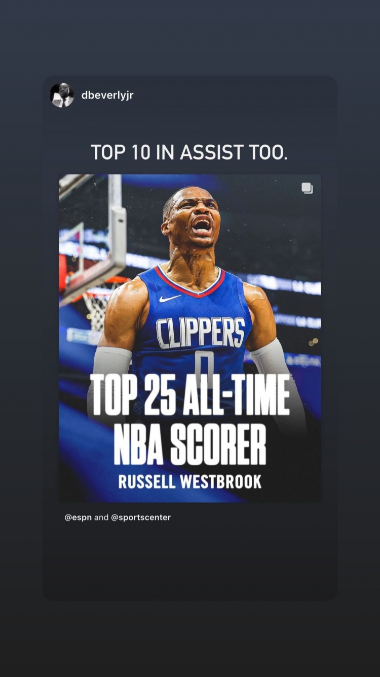 今日威少更新Ins动态转发自己成就,他目前常规赛历史总得分为24821,排名NBA历史第25位,而目前他生涯助攻数为9312,排名历史第9位!