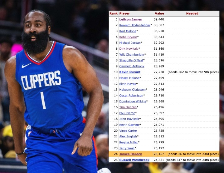 哈登还差26分升至历史得分榜第23!美媒发问:最终能第几?