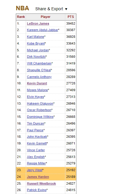 这样,哈登生涯总得分来到25195,追平杰里-韦斯特(25192)升至NBA历史第23位,下一个将追逐雷吉-米勒(25279)。