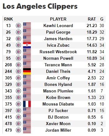 1月8日讯 美媒HoopsHype今日统计了本赛季最新球员RAT值排名,并单列出了快船球员的排名,小卡、乔治、哈登、威少、祖巴茨、鲍威尔均进入联盟前100!RAT值是一种
