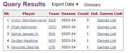 据统计,本赛季的新秀共9次单场砍下30+,霍姆格伦和文班亚马各3次。榜单详情如下: