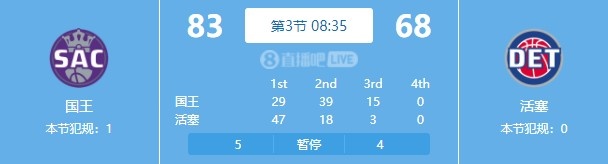 1月10日讯 NBA常规赛,国王对阵活塞。第三节上来国王多点开花,基根-穆雷、福克斯、小萨博尼斯轮番轰炸,一波15-3瞬间拉开分差。