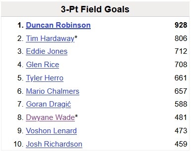 今天,热火官方晒出数据,希罗的生涯三分命中数来到661个,超越查尔莫斯(657个),排名队史第五位。榜单前十如下: