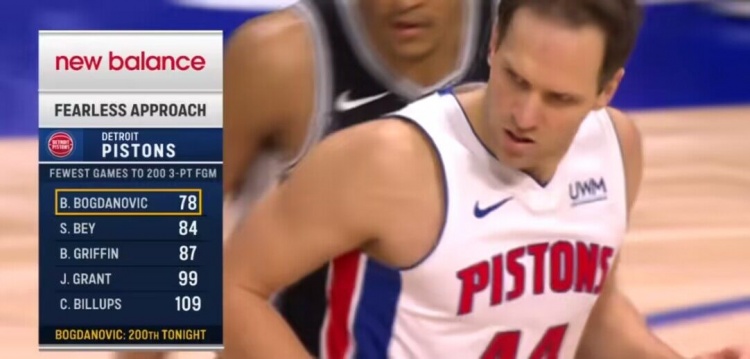 1月11日讯 NBA常规赛,活塞主场迎战马刺。比赛第一节,活塞射手博扬-博格达诺维奇命中一记三分。转播方晒出一组数据:在活塞队史命中200记三分的球员中,博扬用了