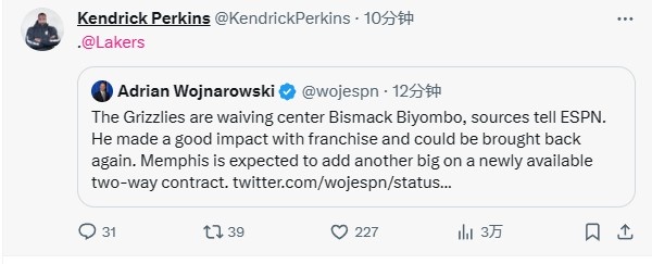 灰熊将裁掉中锋比永博!帕金斯转发并@湖人:快上!