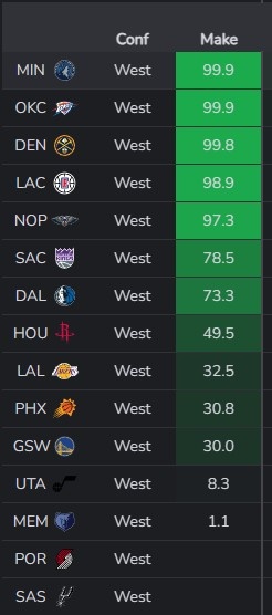 1月12日讯 海外知名数据媒体BBR与DunksAndThrees.com今日根据数据模型预测了本赛季季后赛席位概率。