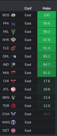 东部方面凯尔特人、雄鹿、76人、尼克斯和骑士进入季后赛的概率均已超过90%,基本锁定一个席位。