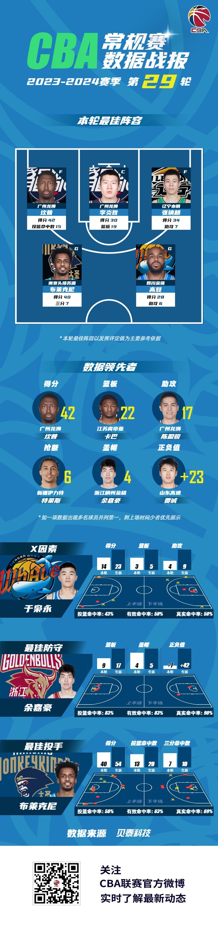 2023-2024赛季CBA联赛常规赛第29轮结束较量,来自龙狮篮球俱乐部的坎普和李炎哲 、辽宁沈阳三生飞豹篮球俱乐部的张镇麟、南京同曦篮球俱乐部的布莱克尼和四川金强篮球俱乐部的高登入选CBA联赛常规赛第29轮最佳阵容!