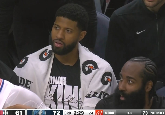 在想啥?威少被唐斯顶翻 转播镜头给到瞪大双眼的哈登和乔治