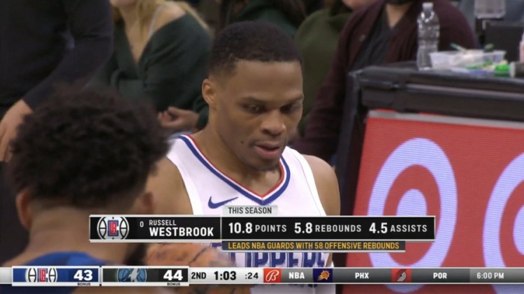 威少本赛季至今共抢下58个前场板 联盟后卫球员中排名第一!