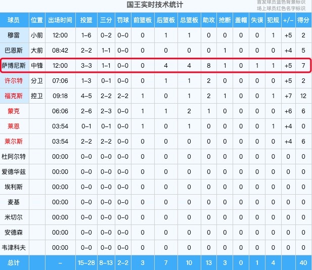 1月15日讯 NBA常规赛,国王首节40-32雄鹿。首节比赛,小萨博尼斯表现出色。他打满首节,投篮3中3,三分1中1,拿下7分4篮板,送出8次助攻,另有1抢断,失误1次,正负值+5。据