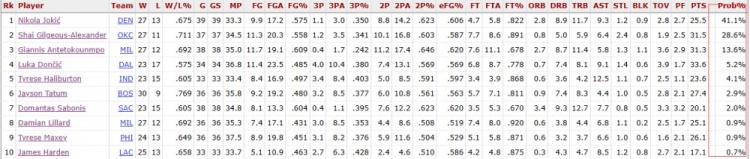 1月15日讯 海外知名数据媒体BBR今日更新了大数据23-24赛季MVP概率,详情如下: