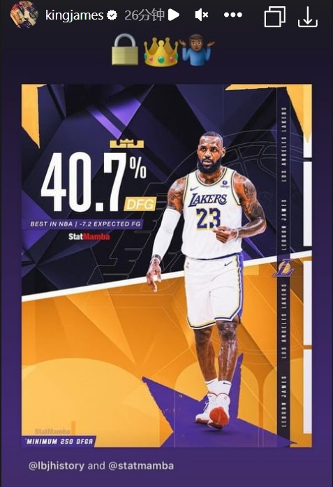 1月17日讯 今日詹姆斯更新INS转发自己本赛季一组数据。据统计,本赛季詹姆斯防守的球员投篮命中率仅有40.7%为联盟最低(至少防守250次投篮)。詹姆斯转发并配文