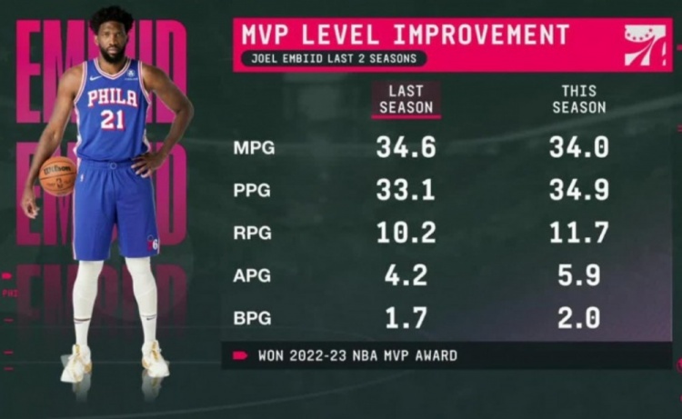 连庄MVP?恩比德近2季对比:出场时间更少 分板助帽全面提升