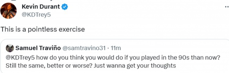 1月17日讯 今天,一位名为Samuel Traviño更推问道:“杜兰特,如果你在90年代打球,你觉得你会打得比现在好还是坏?还是一样?我就是想听听你的想法。”