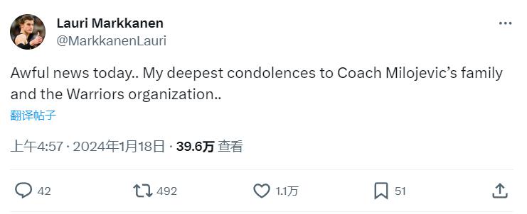 爵士主将马尔卡宁今日也发推:“沉痛的消息……为教练米洛耶维奇的家庭还有勇士队送去最深切的哀悼。”