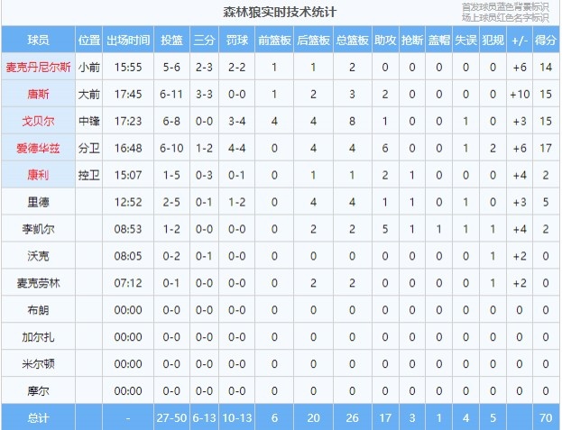 上半场,森林狼首发4人得分上双,麦克丹尼尔斯16分钟6中5,三分3中2、罚球2中2拿到14分2篮板,正负值+6;