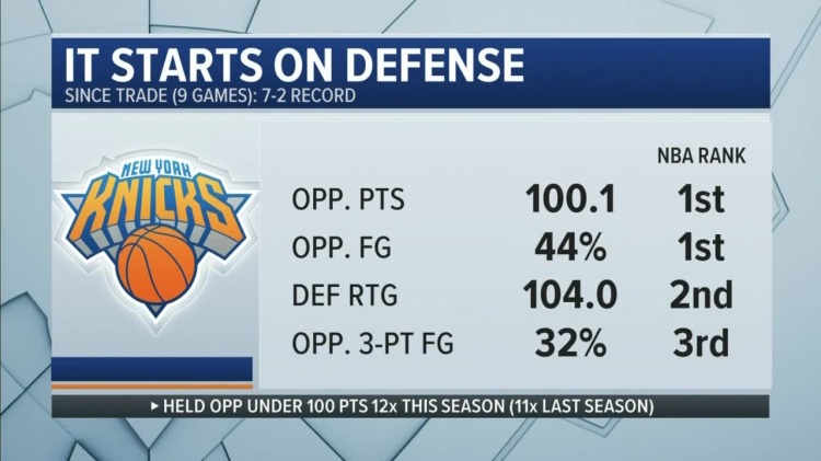 据统计,在完成交易至今,尼克斯9场比赛战绩为7胜2负,场均限制对手得到100.1分,排名联盟第一;限制对手命中率为44%,排名联盟第一;防守效率104排名联盟第2,限制对手三分命中率为32%,排名联盟第3。