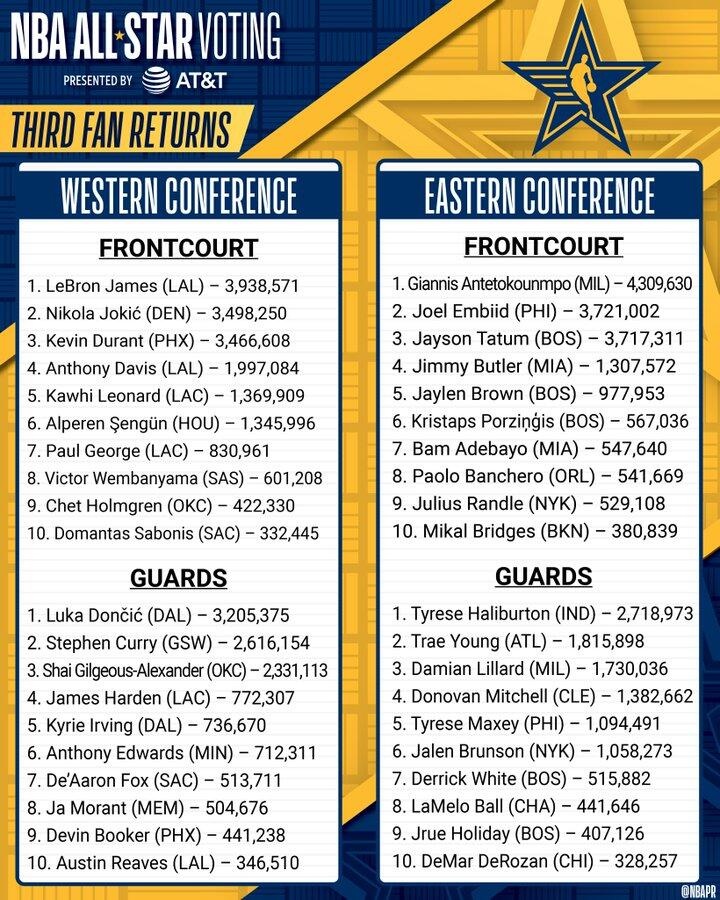 1月19日讯 今日,2024印第安纳全明星第三轮球迷投票结果出炉,字母哥继续领跑票王争夺,詹姆斯领衔西部群星。