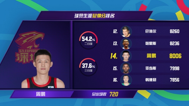 截至目前,周鹏今日突破8000分大关同时,在CBA联赛总得分榜也超越了亚当斯,升至总得分榜第14位。此外,周鹏的总出场数达到720场,位居CBA联赛出场数排名第一位。