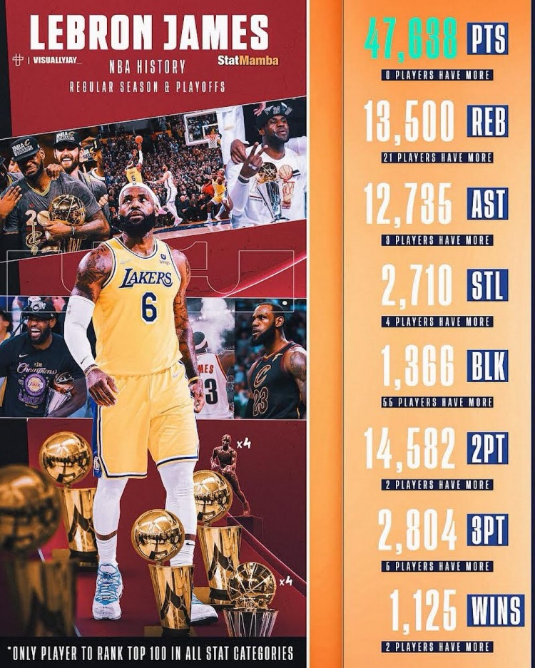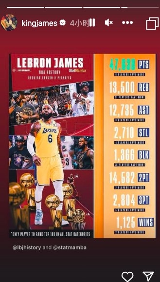 生涯各项总数据都历史前100&NBA历史唯一!詹姆斯转发