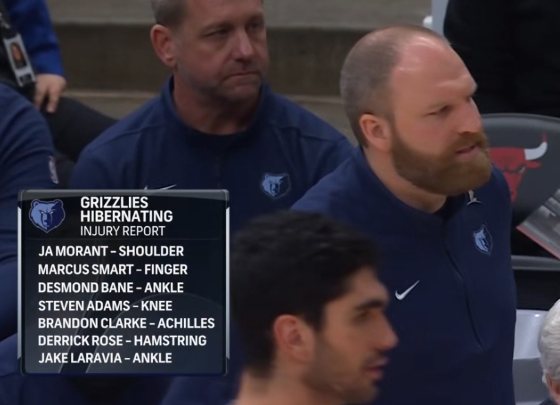 图中灰熊球员伤病一览:莫兰特-肩膀斯玛特-手指贝恩-脚踝亚当斯-膝盖克拉克-跟腱罗斯-腿筋拉拉维亚-脚踝