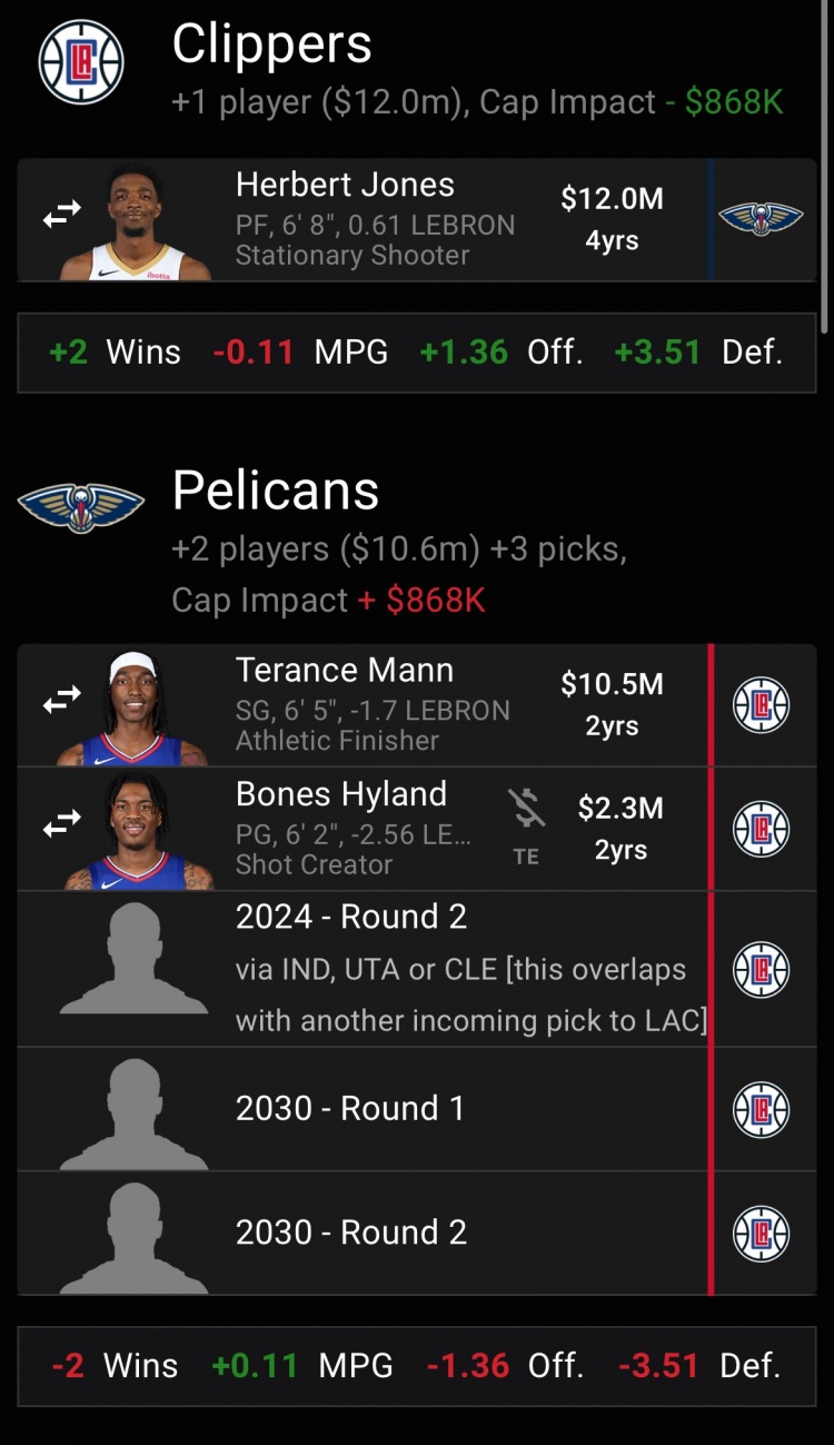 交易方案为:快船出曼恩、海兰德、2030年首轮、2024&2030次轮。得到赫伯特-琼斯。
