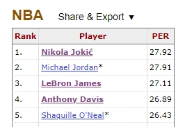 在这场比赛过后,约基奇NBA生涯效率值来到27.92,超越迈克尔-乔丹(27.91)升至历史第一。