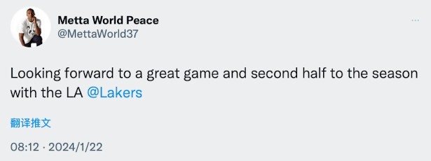 1月22日讯 今日前湖人球员阿泰斯特更新推特谈及湖人。