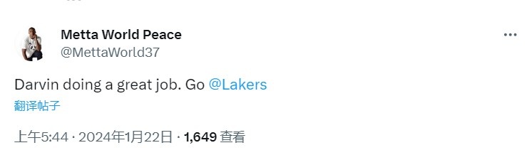1月22日讯 今日前湖人球员阿泰斯特更土力挺湖人主帅哈姆。阿泰斯特写道:“达尔文(哈姆)工作做得很好,湖人冲啊!”目前湖人战绩为21胜22负,暂时排名西部第10。