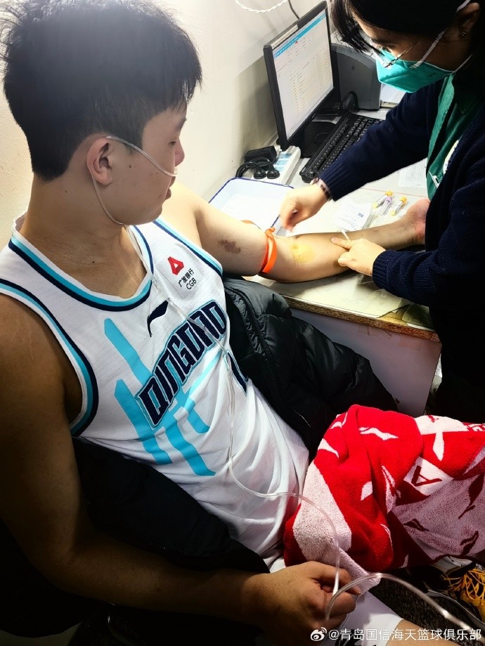 2024年1月21日,在青岛对阵吉林的比赛中,杨瀚森受伤倒地,时查体征:呼吸不畅、手脚发冷,自觉头晕恶心。遂由救护车送至当地合作医院进行诊治,紧急进行心电图、心肌酶、生化全套等检查。凌晨检查报告显示:钠钾离子指标偏低,其余指标正常。初步诊断为电解质失调,已排除心肌炎及心肌损伤的可能。