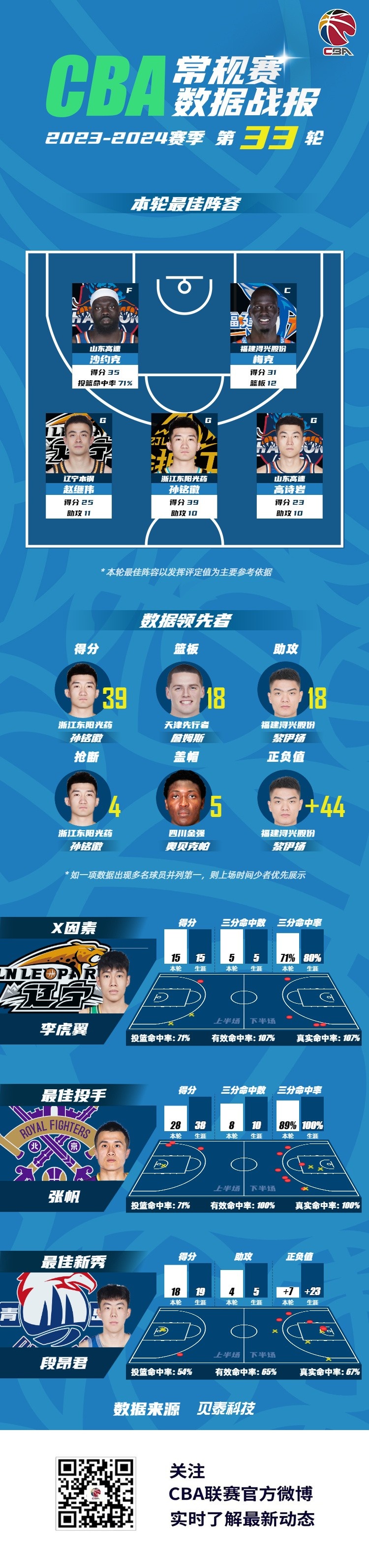 数据领先者方面:浙江东阳光药球员孙铭徽以单场39分的数据领衔得分榜;