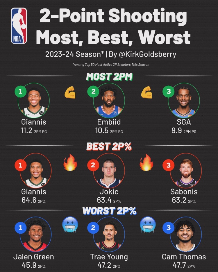 本季二分之最:字母哥场均命中11.2个最多且最准 杰伦-格林最铁