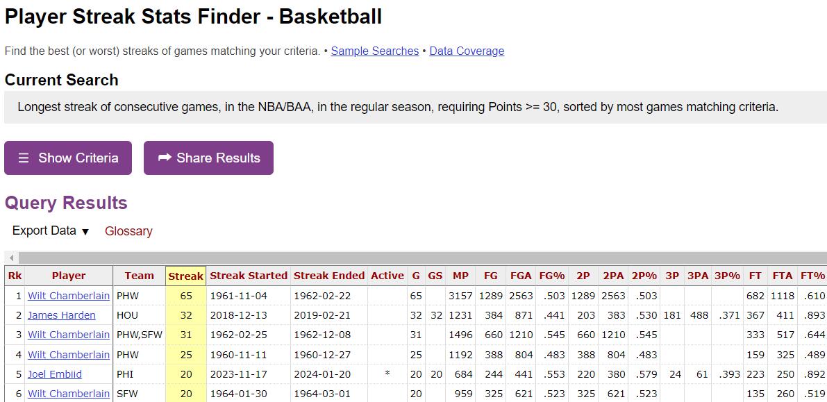这是恩比德连续第21场30+,超越张伯伦的20场,独占历史第五!下一个将继续追张伯伦的25场。