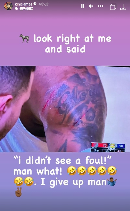 詹姆斯晒伤口:裁判说“我没看到犯规” 佛了♂️