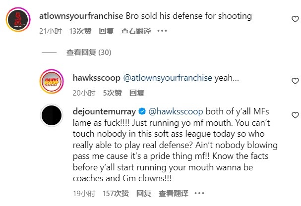 穆雷回应道:你们真TM的差劲!你们只会动动嘴皮子!在今天这个软蛋联盟,你不能碰任何人,所以谁会真正地防守?没有人能轻松过我,这是一件值得骄傲的事!在你们想像教练和经理那样动嘴皮子之前,先了解一下事实!小丑!