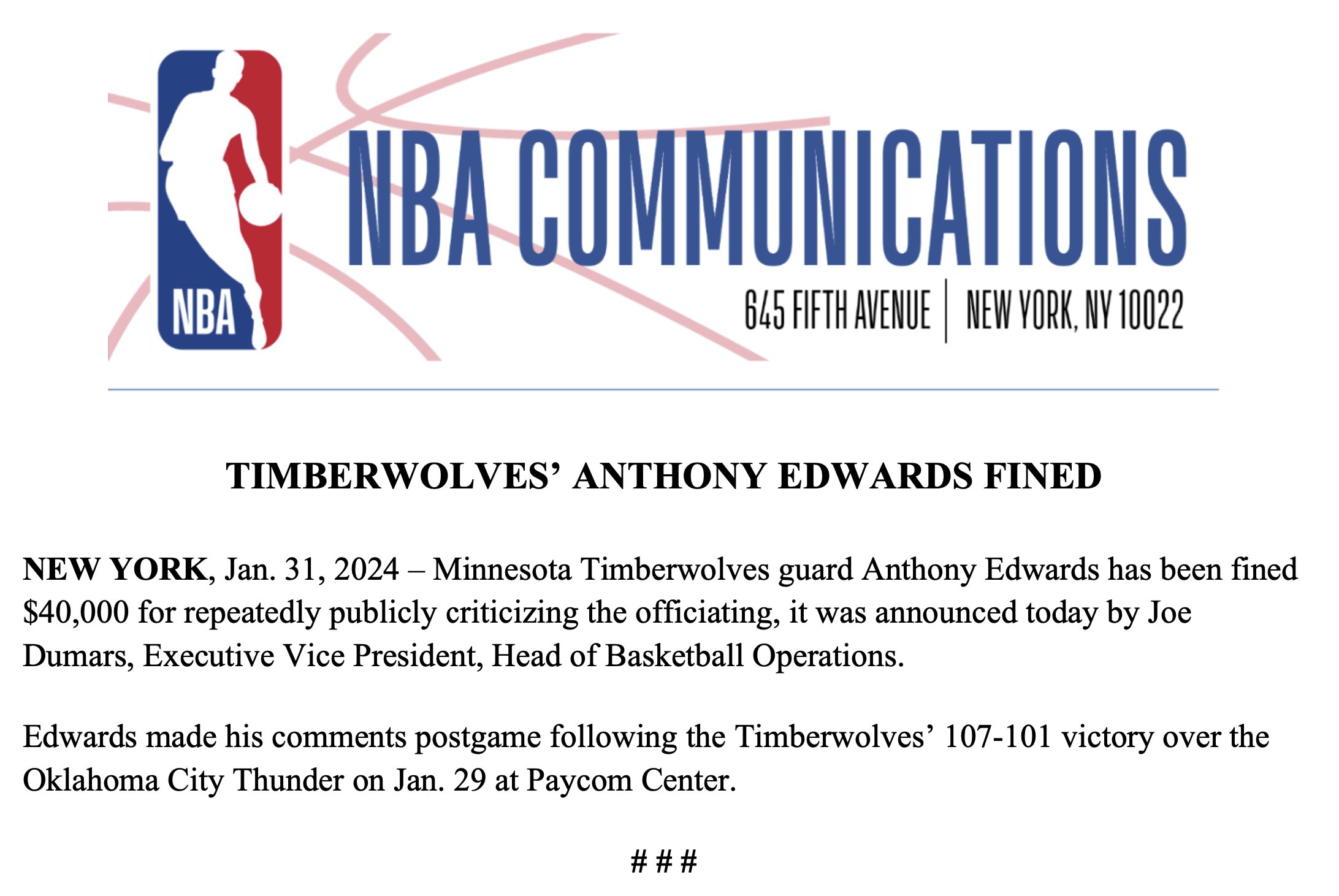 NBA官方:爱德华兹多次公开批评判罚 被重罚4万美元!
